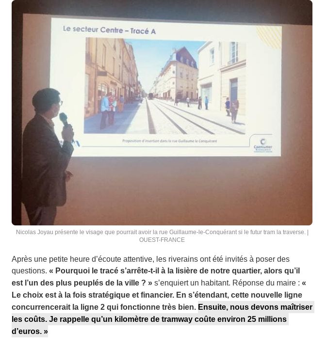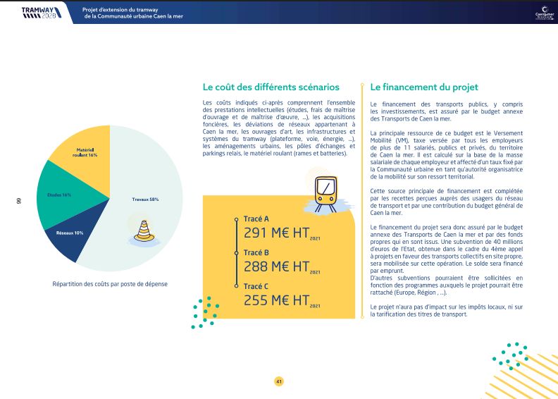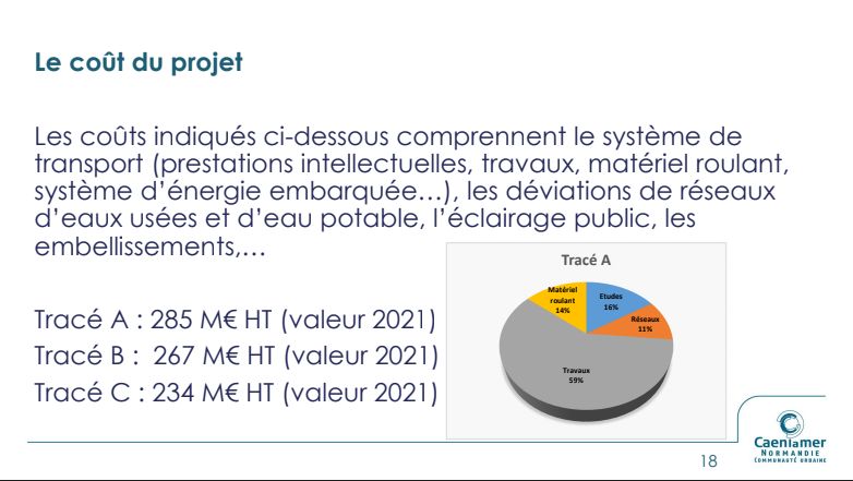 D’où vien­dra cet argent ? Si une sub­ven­tion de 40 mil­lions a été obte­nue de l’Etat en 2022, ce pro­jet sera, dans sa grande majo­ri­té, finan­cé par Caen la mer : le dos­sier de concer­ta­tion dis­tingue les fonds propres de Caen la mer et un emprunt mais c’est bien au final un finan­ce­ment sur le bud­get de Caen la mer : il est donc impé­ra­tif de mesu­rer au mieux le mon­tant de la dépense afin de faire les bons choix, en matière notam­ment de tracés.