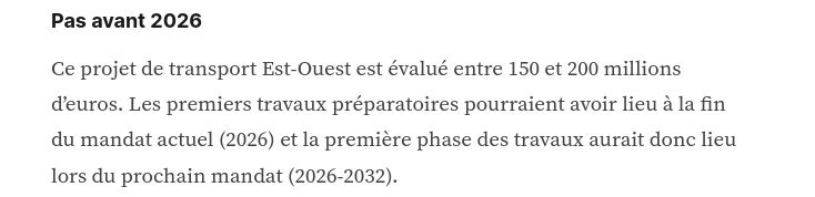 Le coût de l’investissement consa­cré au pro­jet de ligne « Est-Ouest » est en revanche très variable selon le choix du tra­cé : la dépense com­prend les frais liés aux études (16%), l’achat des rames sup­plé­men­taires (16%), et toutes les dépenses liées aux tra­vaux (68%). Il est clair que seules ces der­nières dépenses (les tra­vaux) varient en fonc­tion du tra­cé. Par exemple, le tra­cé A est de 11,6 km dont 10,3 d’infrastructures nou­velles et le tra­cé C compte 9,8 km dont 8,5 d’infrastructures nou­velles. Sur la base d’un coût de 25 mil­lions d’euros par km, la dif­fé­rence est facile à évaluer.