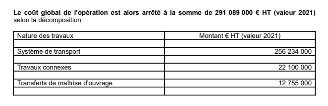 • Sep­tembre 2022 : « entre 255 et 291 mil­lions » (dos­sier de concer­ta­tion – sep­tembre 2022)
